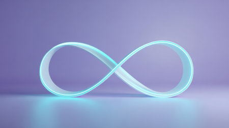 A glowing infinity symbol appears in soft blue light against a purple background. It stands alone, symbolizing endless possibilities and creativity in a modern design.