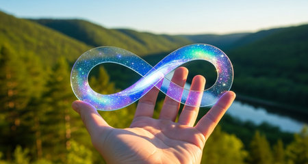 A hand holds a glowing infinity symbol with a cosmic effect against a scenic nature background