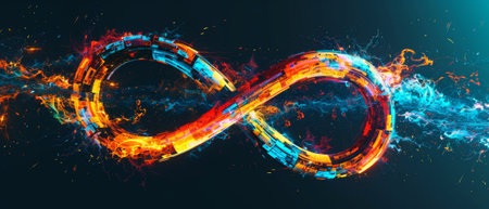 An illuminated infinity symbol is presented against a black background. The artwork shows an eye-catching display of light trails, blending shades of blue, orange, and red. This conceptual image may be suitable for design, advertising, or artistic projects, and serves as a visual metaphor.
