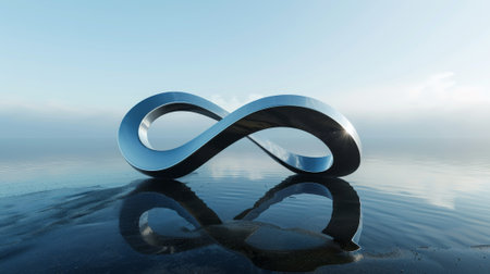 Stunning 3D rendering of abstract surreal background with geometric infinity shape. Zen landscape, calming waters, chrome moebius loop and blue gradient sky.