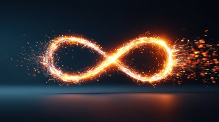An enchanting infinity symbol bursts with light trails and shimmering particles, capturing ideas of forever and endless potential against a dark backdrop.