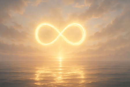 Horizontal scene of a golden infinity symbol floating above the sea. Elegant metallic gold tones reflect light over calm ocean water, creating a serene and luxurious atmosphere. Concept of eternity, balance, spirituality, success, and endless possibilities.
