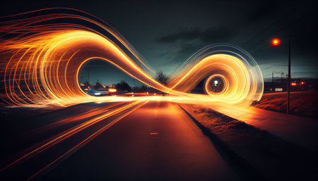 This stunning image showcases an artistic interpretation of infinity, featuring glowing light trails above a vibrant cityscape at night. The scene captures a sense of dynamic energy and mystery, perfect for various creative projects.