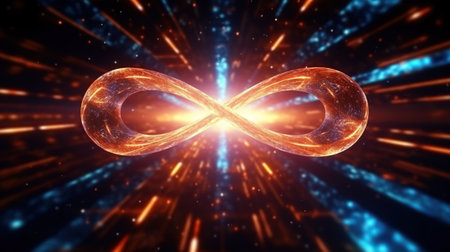 Abstract futuristic glowing infinity sign with colorful digital trails.