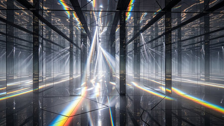 Abstract patterns of light and color created by reflections and refractions in a modern, mirrored space.