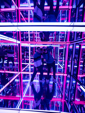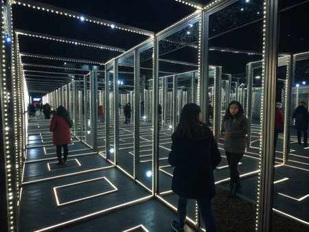 Woman dressed in dark clothing navigates a reflective mirror maze, her figure repeatedly reflected in the glass walls