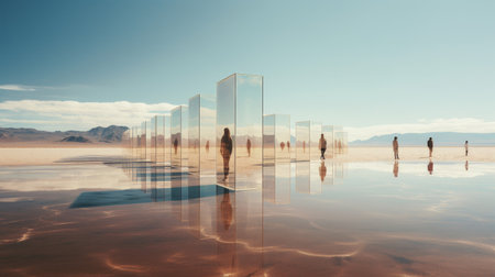 Surreal landscape with mirror reflecting water in a desert. Modern surrealism and contemporary art concept. Nature and environmental protection idea. Copy space.