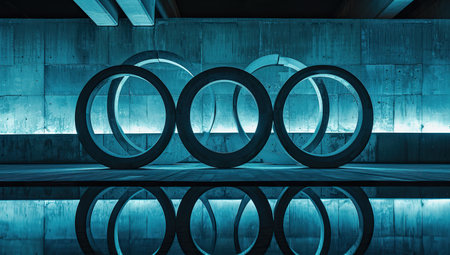 Black circular structures in blue-gray architecture with reflections in the water. Modern design and geometry concept.