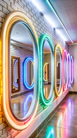 A stunning mirror is encircled by a vibrant explosion of colorful spheres, creating a mesmerizing visual effect. This dynamic composition blends shades of pink, orange, blue, and purple, inviting viewers to explore the interplay of color and reflection.
