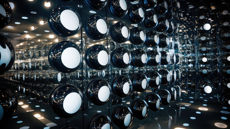 A mesmerizing display of light bulbs hanging from the ceiling, reflected infinitely in a mirrored room, creating a sense of depth and wonder.
