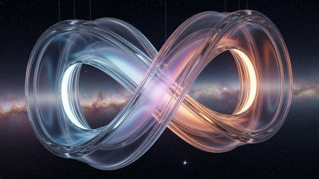A transparent glass infinity symbol with blue and orange light glows, floating in a starry galaxy background.