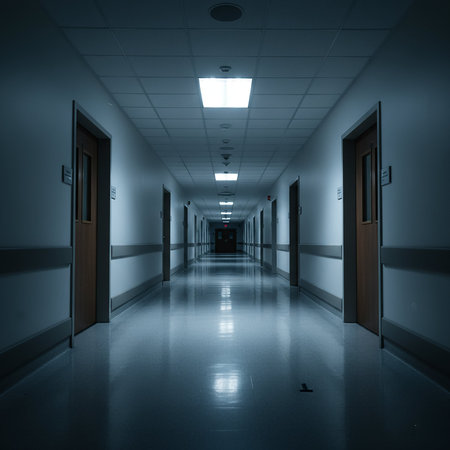 Abandoned Hospital Corridor with Harsh Fluorescent Lighting