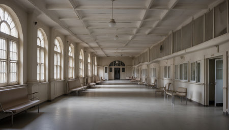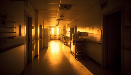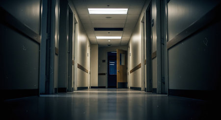 Modern hospital corridor with polished floors and bright, clean lighting. Healthcare facility with organized, sterile environment. Medical background.