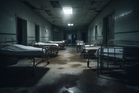 Interior of a hospital with empty beds in a dark room.