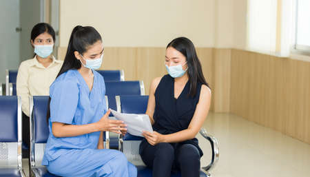 The female medical staff is presenting a treatment plan for the patient while sitting in the hospital reception area. The doctor is notifying the patient's medical expenses.