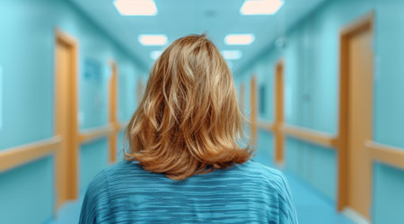 Blond woman walking down a hospital corridor