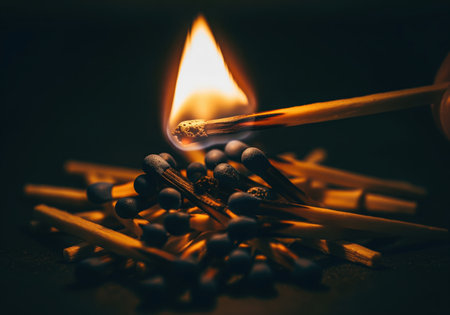 Single wooden matchstick burning brightly, held over a scattered pile of unlit matches with dark tips. the intense flame provides warm light against the moody, dark background, symbolizing ignition and potential.