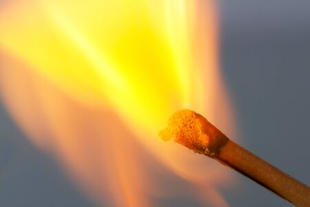 Burning matchstick with vibrant flame on dark background. Fire and heat concept.