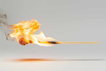 A matchstick bursts into vibrant flames, suspended in air, with smoke trailing behind. The fiery glow contrasts beautifully against a soft backdrop, hinting at an impending spark.