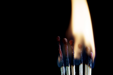 The stages of match burning on a black background. matchsticks with red head. Different stages of matchstick burning. copy space