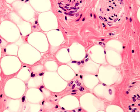 Small adipocyte lobule located in a connective tissue. A small nerve is located in the upper right corner. Light micrograph. H&E stain.