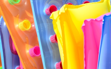 Inflatable rings and arm floats on color background