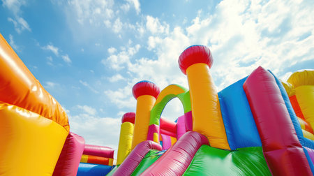 This image showcases a vibrant, colorful inflatable play structure under a bright blue sky with fluffy clouds. It represents joy and playful outdoor recreation for children.