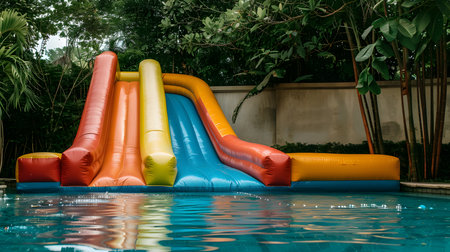 Vibrant inflatable water slide next to a pool, surrounded by tropical plants, creating a playful atmosphere for summer enjoyment and family gatherings