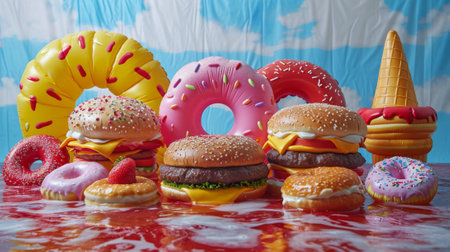 A group of hamburgers and ice cream cones are sitting on top of a table, AI