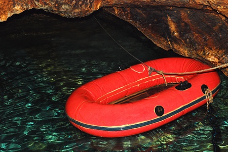 Inflatable rescue boat equipped with steering console. Safe haven for exploration a red inflatable boat rests peacefully at the pier ready to embark on new adventures.