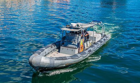 Tel Aviv Israel February 08, 2020 View of a police boat in the marina of Tel Aviv in the afternoon