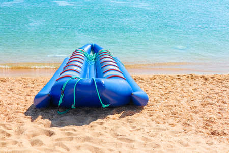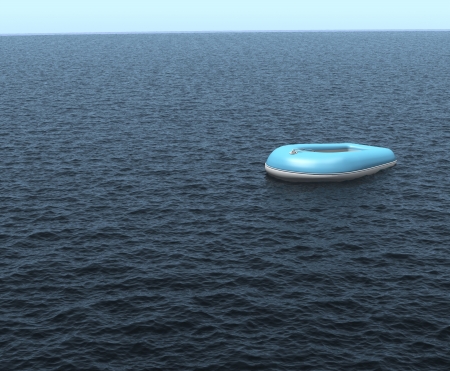 Inflatable boat on bright blue background in pastel colors. Minimalism concept. 3d render