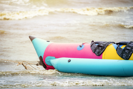 The Beach of east cost India at the Sunrise in a clear morning Spring time with a banana boat.