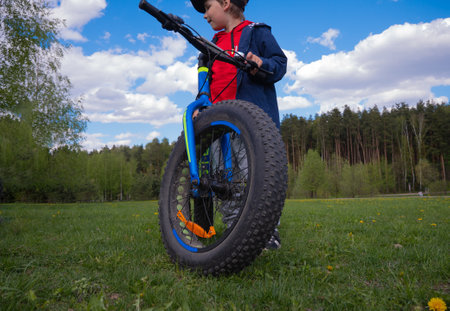 Close-up bicycle wheel on a forest path, active lifestyle, outdoor sports. High quality photo