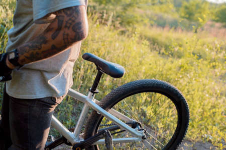 Cyclist and his bicycle at urban recreation