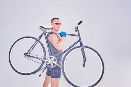 Handsome sports man with a Bicycle on his shoulder for any purpose
