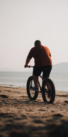 Overweight man in activewear riding a fat bike along a sandy beach at sunset, back view capturing outdoor exercise, determination and body-positive fitness journey