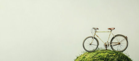 Vintage bicycle on green grass with white wall background. Copyspace.