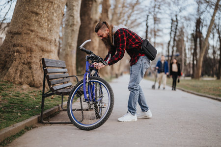 Focused man repairing a bicycle on a sunny city day