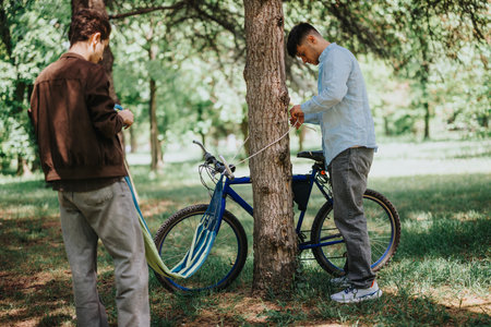 Young man inflates bicycle tire using pump, concept of bike maintenance, outdoor activity, urban mobility