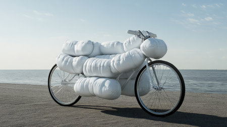A sleek bicycle is enclosed within a glass-like structure, highlighting creativity.