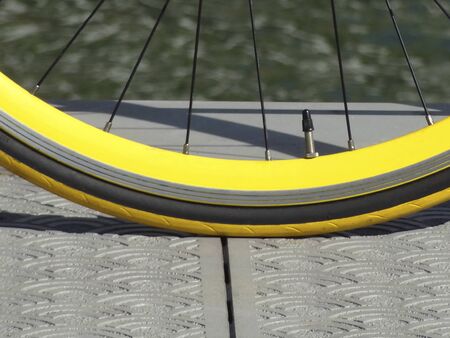 Old bicycle front wheel detail with tyre valve