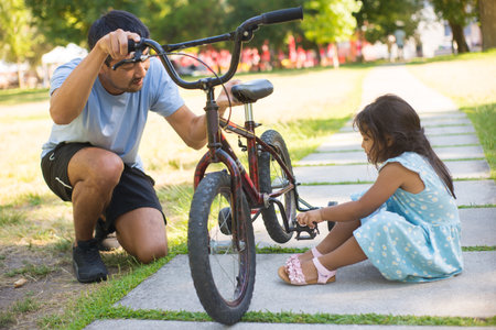 Side view of Asian dad and little girl sitting with small bike. Young father and his daughter sitting on pavement in park looking and touching parts of bicycle. Kids leisure and parenthood concept .