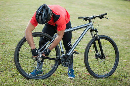 Good-looking young man fixing a problem with a bike tire