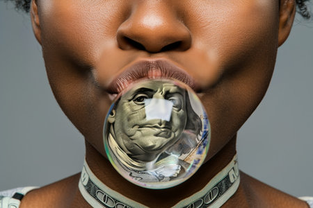 An African-American woman with a dollar collar inflates a soap bubble with a dollar inside.