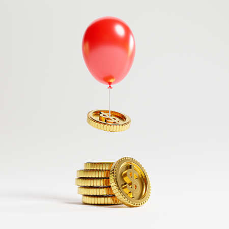 Golden coin flying from coins heap by red balloon for money and economy inflation after covid-19 pandemic concept by 3d render.