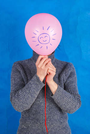 Top view image of balloon with sad face over blue background. Concept of emotions and sadness or stress