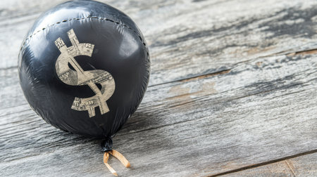 A striking black balloon featuring a dollar sign, set against a rustic wooden surface. This image symbolizes wealth and prosperity, making it perfect for financial themes.