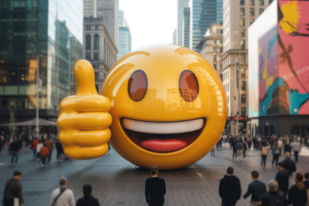 A colossal, smiling emoji balloon with a thumbs-up gesture dominates a busy city intersection, bringing a touch of playful whimsy to the urban landscape.