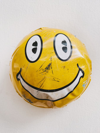 Close-up of a worn, bright yellow smiley face balloon against a white wall.